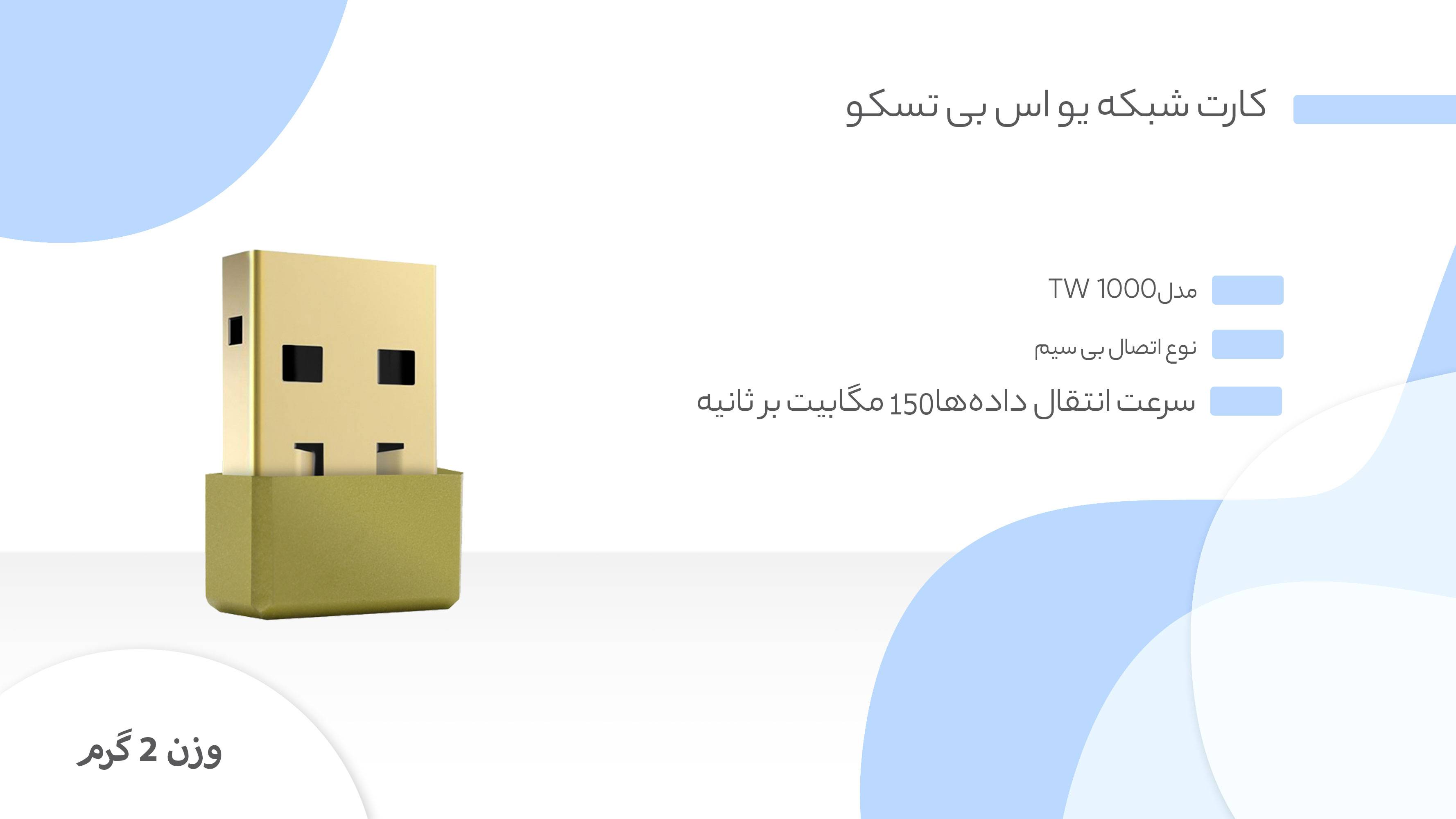 با فراگیر شدن تکنولوژی WIFI و وجود مودمهای بیسیم در اکثر خانهها و ادارات و محل کارها، نیاز به دریافتکنندهی این امواج بیش از پیش احساس میشود. تعداد بسیار زیادی از پیسیهای قدیمی و یا حتی جدید فاقد گیرندهی داخلی WIFI هستند و برای همین باید یا با کابل به اینترنت وصل شوند یا به گیرنده مجهز شوند. دانگلهای WIFI این مشکل را برطرف کردهاند. با وصل کردن دانگل WIFI به پورت USB دستگاه، کامپیوتر شما به راحتی به اینترنت وصل میشود و دیگر نیازی به باز کردن کیس کامپیوتر و قرار دادن قطعهی گیرندهی WIFI داخل دستگاه نخواهد بود. کارت شبکهی TW1000 محصولی از برند تسکو است که از طریق USB به رایانه متصل میشود. ابعاد این کارت شبکه مانند یک فلشمموری بند انگشتی است که به راحتی میتوان را به رایانه متصل کرد و از وجود شبکهی بیسیم لذت برد. از ویژگیهای بسیار خوب این محصول میتوان به پشتیبانی آن از سیستم عاملهای رایج و به خصوص نسخههای مختلف سیستم عامل ویندوز اشاره کرد. این کارت شبکه از استاندارد IEEE 802.11 b g n پشتیبانی میکند و برای بالابردن امنیت شبکه از تنظیمات امنیتی WEP WPA/WPA2 بهره میبرد.